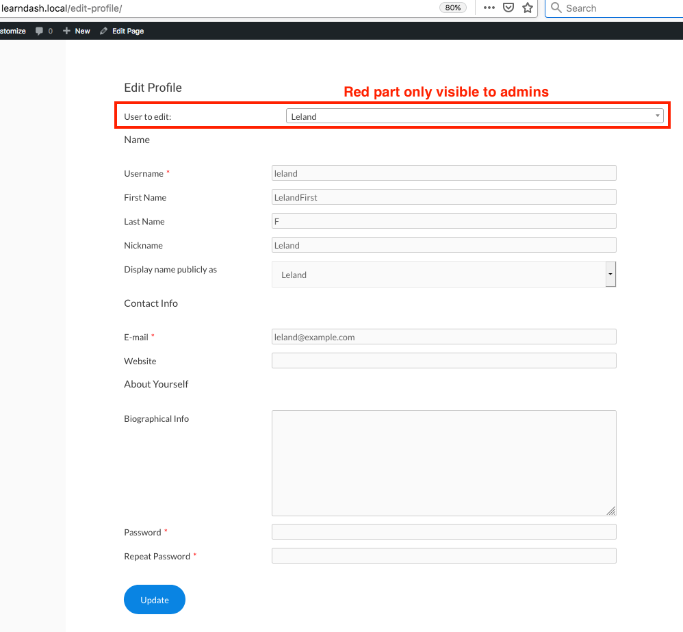 However, if a student clicks the “LearnDash” Edit Profile link (really, the WordPress edit profile link) they’ll still be directed to the backend of WordPress.