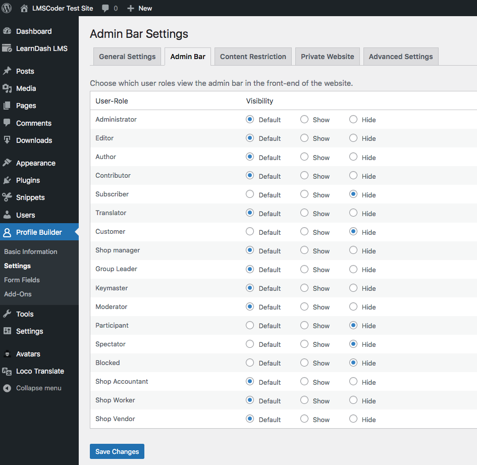 There are handy plugins like Hide Admin Bar that help with this, although there is a feature in the Profile Builder plugin we have installed, so we’ll just use that.